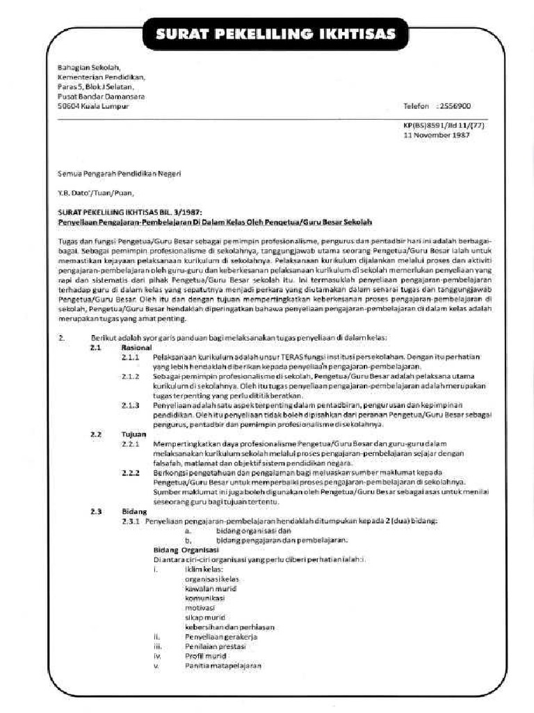 PEJABAT KETUA PENGARAH PENDIDIKAN MALAYSIA PARAS 7 BLOK J PUSAT BANDAR DMANSARA 50604 KUALA LUMPUR Ruj. SURAT PEKELILING IKHTISAS BIL. Semenjak Surat Pekeliling Kementerian Pendidikan 256 dikuatkuasakan terdapat amalan di mana.